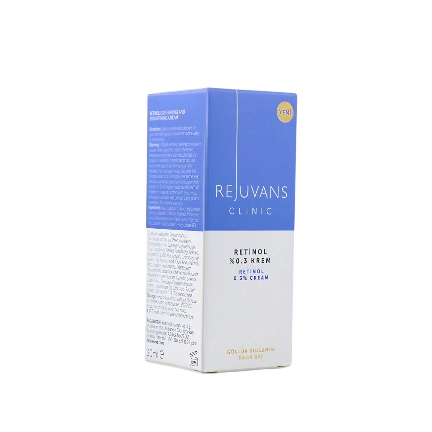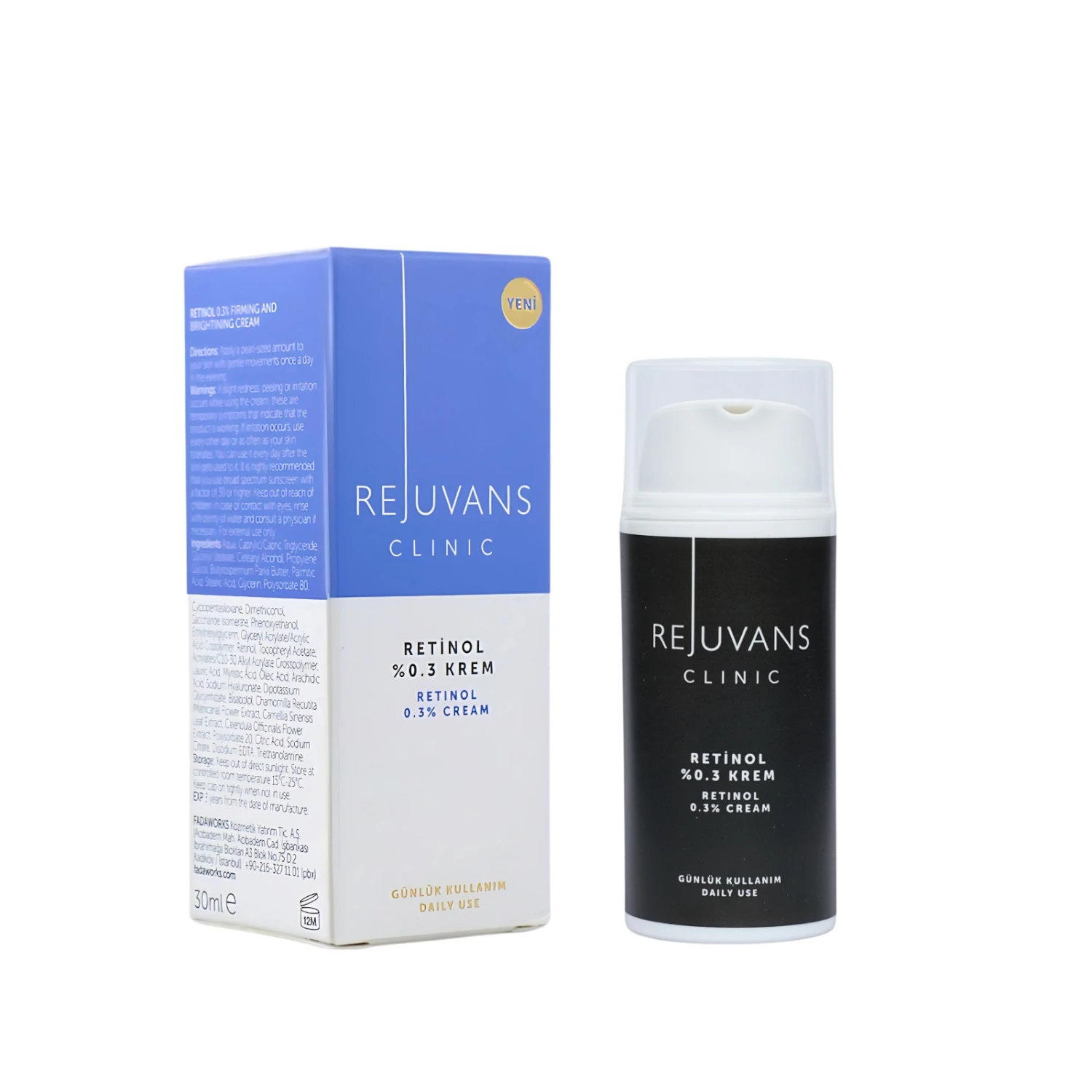 Rejuvans Clinic Retinol 0,3 % Cream ölü hücrelerin birikmesini önleyerek gözenek oluşumunu önlemeye, ince çizgileri ve kırışıklıkları hafifletmeye yardımcı olur. Koyu lekelerin açılmasını,cildin daha parlak ve pürüzsüz görünmesini destekler.